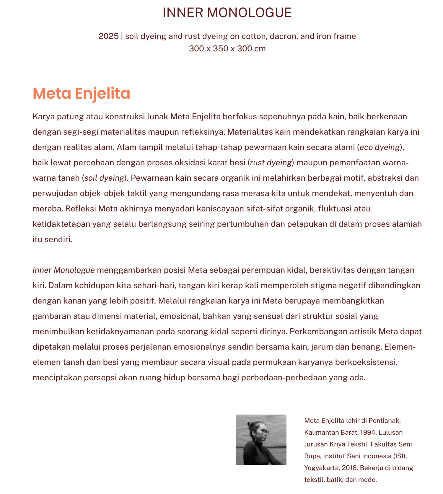 Ef ye i, Mbak Meta ini kidal. Dan karya yang dibuat pakai kain dengan warna-warna alamiah di atas menggambarkan perasaan mbak Meta selama menjadi kidal dari POV orang lain. Kita tahu sendiri kalau orang kidal selalu dibully. Bahwa tangan yg baik itu tangan kanan. Tangan kiri untuk cawik saja. Untuk hal-hal “buruk” saja.