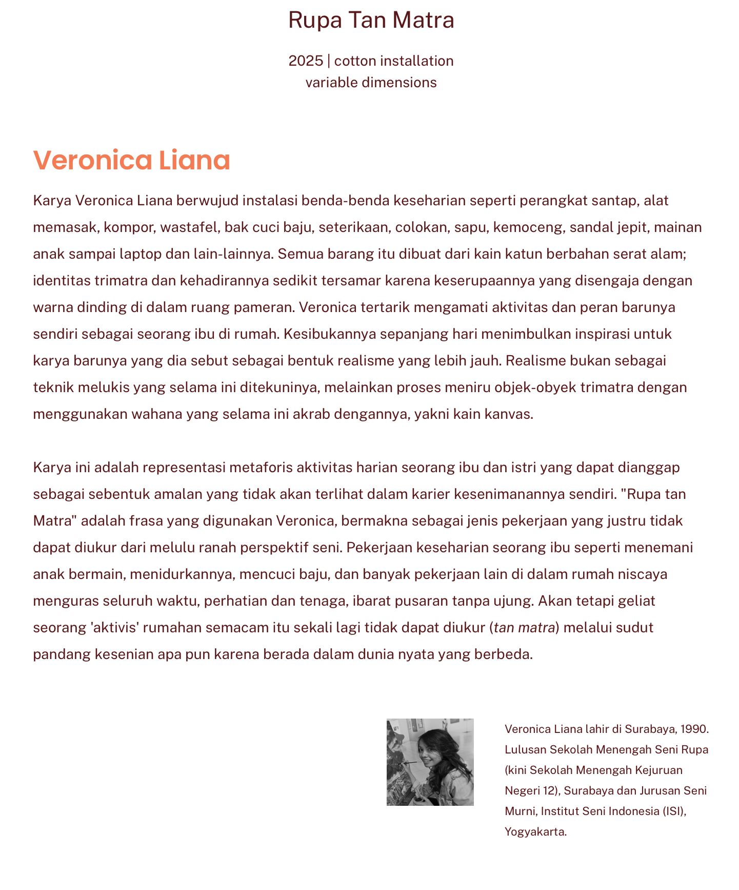 “Something else” yang unik lagi adalah karya mbak Veronica Liana ini. Judul karya seni ini adalah Rupa Tan Mantra. Jadi dia membuat benda sehari-hari as an ibu rumah tangga, kayak piring, wastafel, gas elpiji, leptop, bahkan mainan anak-anak, keran air, dan lain-lain dari bahan kain kanvas. Mbak Veronica ini pelukis, namun kesibukannya sebagai ibu rumah tangga membuat dia gak sempet melukis lagi.