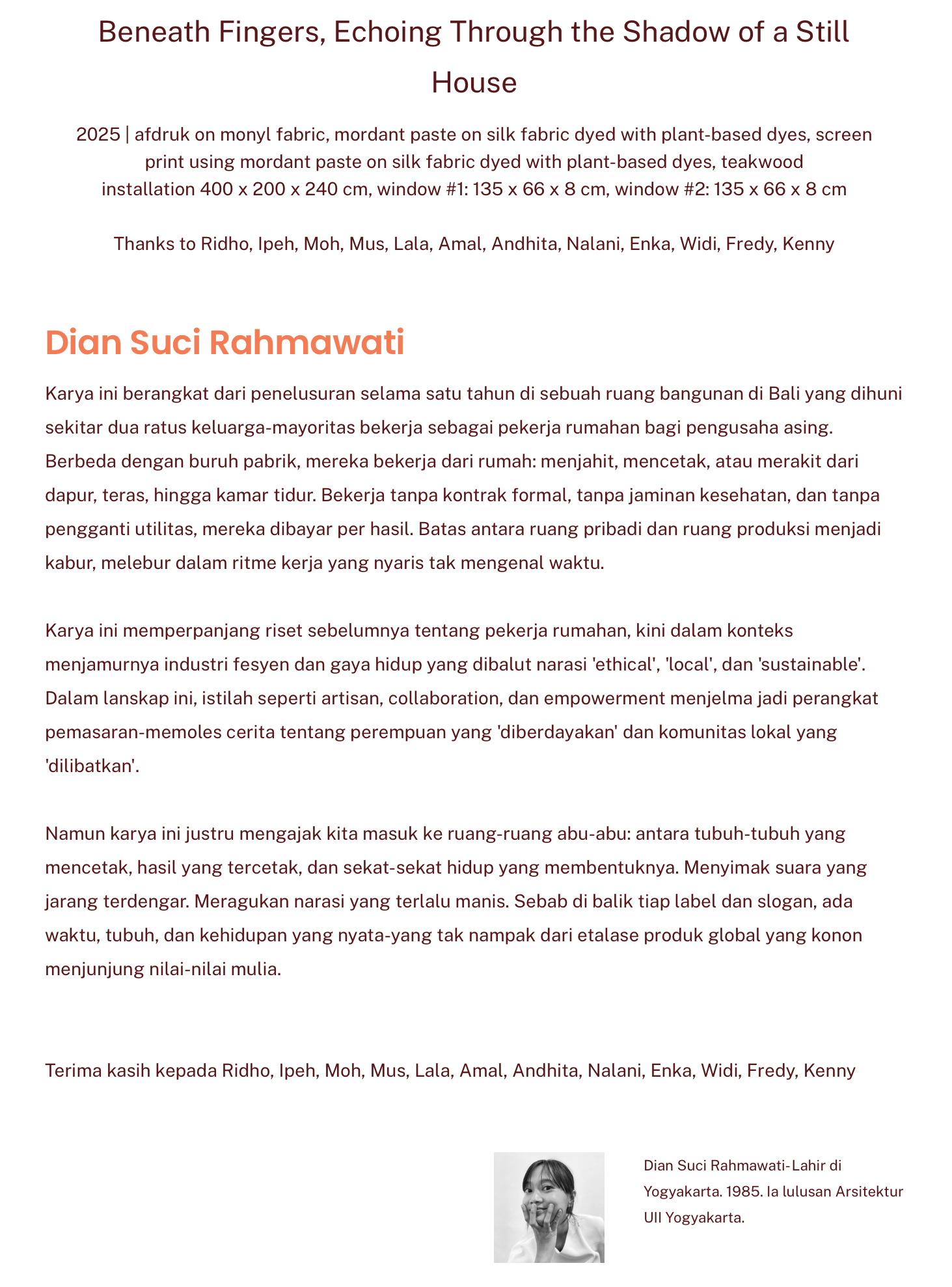 So, judul karya ini adalah Beneath Fingers, Echoing Through the Shadow of a Still House by Dian Suci Rahmawati. Sudah abstrak, eh pake bahasa enggres. Mbak Dian, ampuuun! Hora mudeng! Hahaha.
