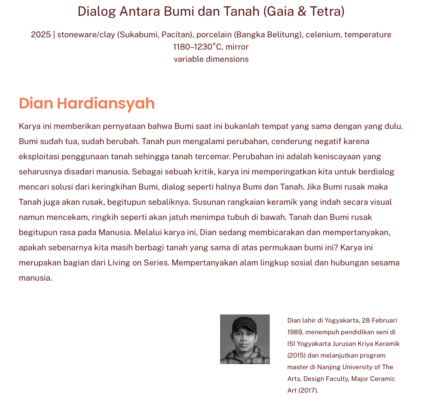 So, dari judul karyanya, “Dialog Antara Bumi dan Tanah (Gaia & Tetra)” by Dian Hardiansyah, baru ngeh kalau makhluk panjang-panjang itu adalah alat komunikasi tanah dan bumi. Mereka berkomunikasi tentang solusi mengatasi kerusakan bumi.